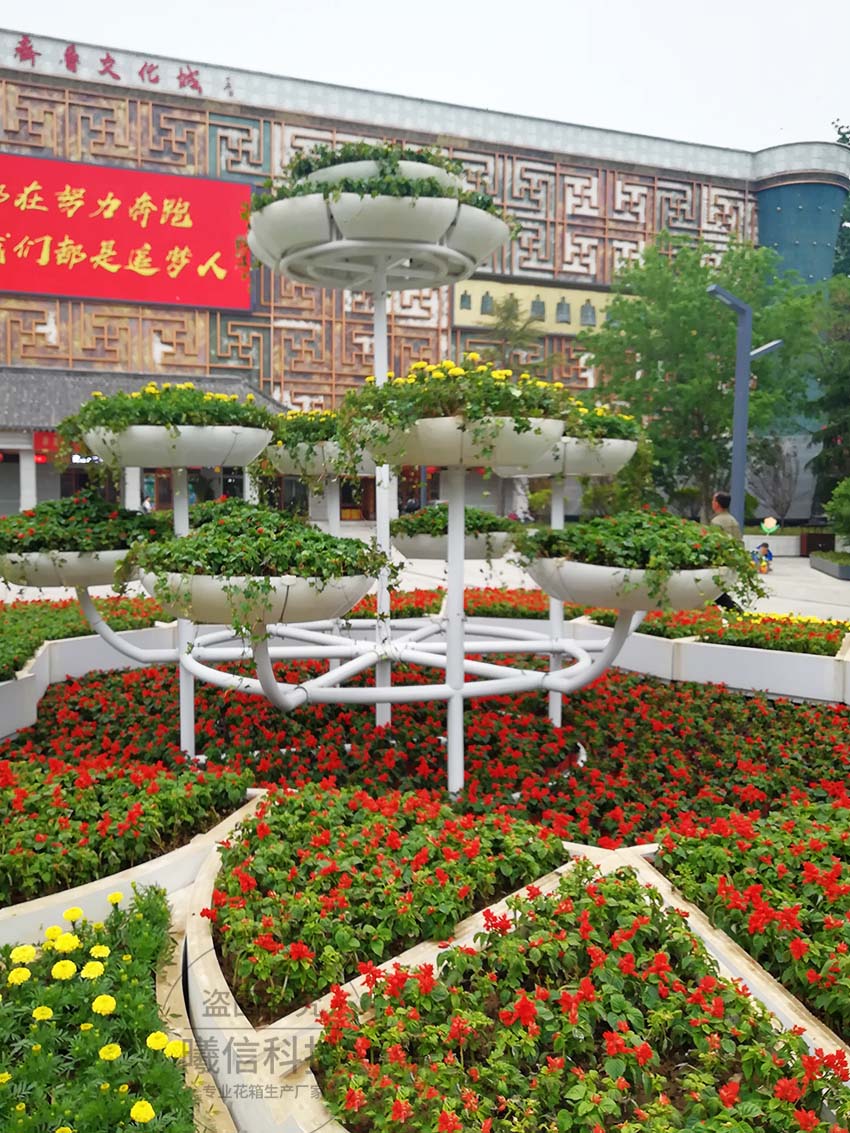 花箱也可以成為廣場(chǎng)公園綠化的主體。這款花箱擬花朵的形態(tài),組成了萬(wàn)花叢,與花架一起成為了廣場(chǎng)的主體焦點(diǎn)。